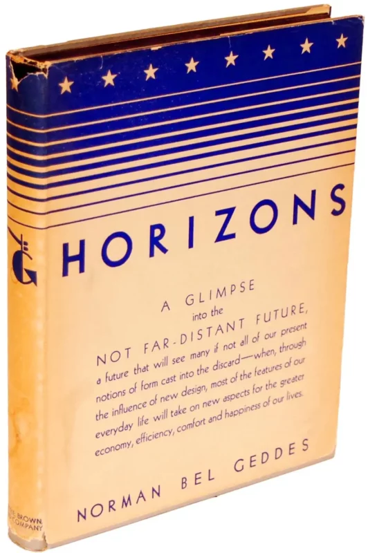 En 1932 (soit un an après La fin du Monde), le designer publie un livre intitulé Horizons (dont To New Horizons se fait l’écho) et qui s’ouvre sur ces lignes : « Nous entrons dans une nouvelle ère. Sommes-nous prêts pour les changements qui arrivent ? Les maisons que nous allons habiter demain ne ressembleront guères aux maisons que nous habitons à présent. Les voitures, trains, théâtres, cités, l’industrie elle-même, sont en train de se transformer. De même que l’art sous toutes ses formes. » Geddes y note la disharmonie propre au monde industriel dans lequel « au milieu d’une mélancholie mondialement diffusée par une dépression économique, un nouvel âge se lève et amène de vivifiantes conceptions et révèle un nouvel horizon. » L’objectif du design streamlining est de retrouver le dessus dans les processus de la mécanique, car pour l’instant, les hommes « échouent à constater que l’âge des machines n’est pas encore advenu. Bien que nous construisions des machines, nous n’avons pas encore l’aisance nécessaire pour les dominer ». Geddes s’empare des moyens de communications et se met à rêver de voitures volantes, de méga-dirigeables et d’une société autonome et entièrement fluide. Curieusement, tandis que le design industriel naît comme moyen de redessiner la mécanique des transports (Norman Bel Geddes ouvre son cabinet en 1927), l’aéronef devient le symbole de la SF pour Hugo Gernsback à partir de 1928.