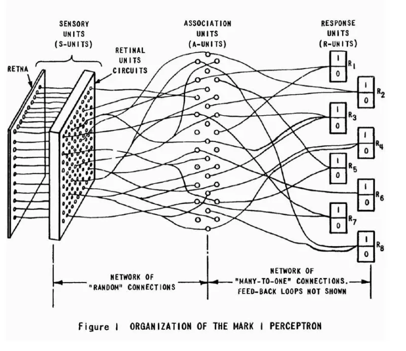 Un Perceptron de Rosenblatt est composé d’ « unités sensorielles » (quatre cents cellules photoélectriques), suivies d’ « unités d’association » (une couche de neurones) et d’une « unité d’activation » (une lampe qui s’allume). En fonction de la forme des objets présentés au Perceptron, certaines de ses « unités sen – sorielles » (les capteurs photoélectriques) s’activent et envoient un signal aux « unités d’association » ou « neurones ». Ces derniers réalisent trois opérations :