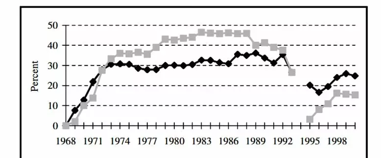 | 1973 | 40.5 | 59.5 | 65.7 | 34.3 |
