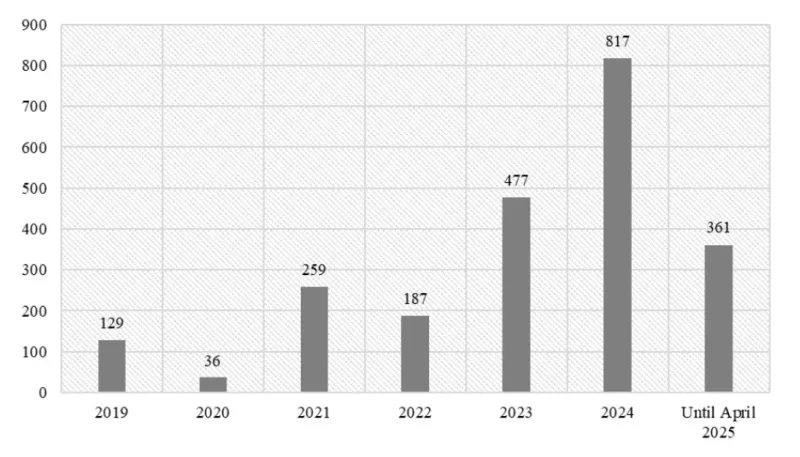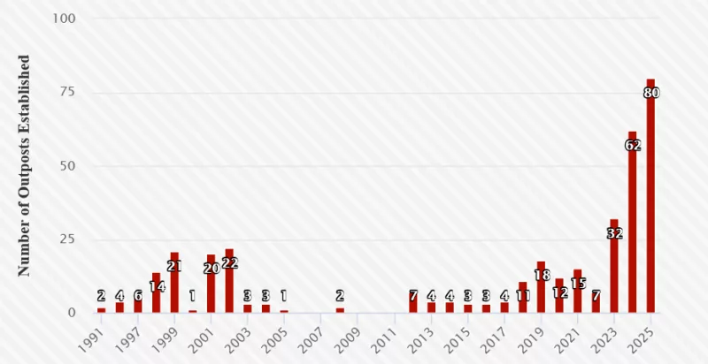 Nombres d’avant-postes établis par an (Chiffres de Peace Now au 10/12/2025 [consulté le 11/01/2025].)